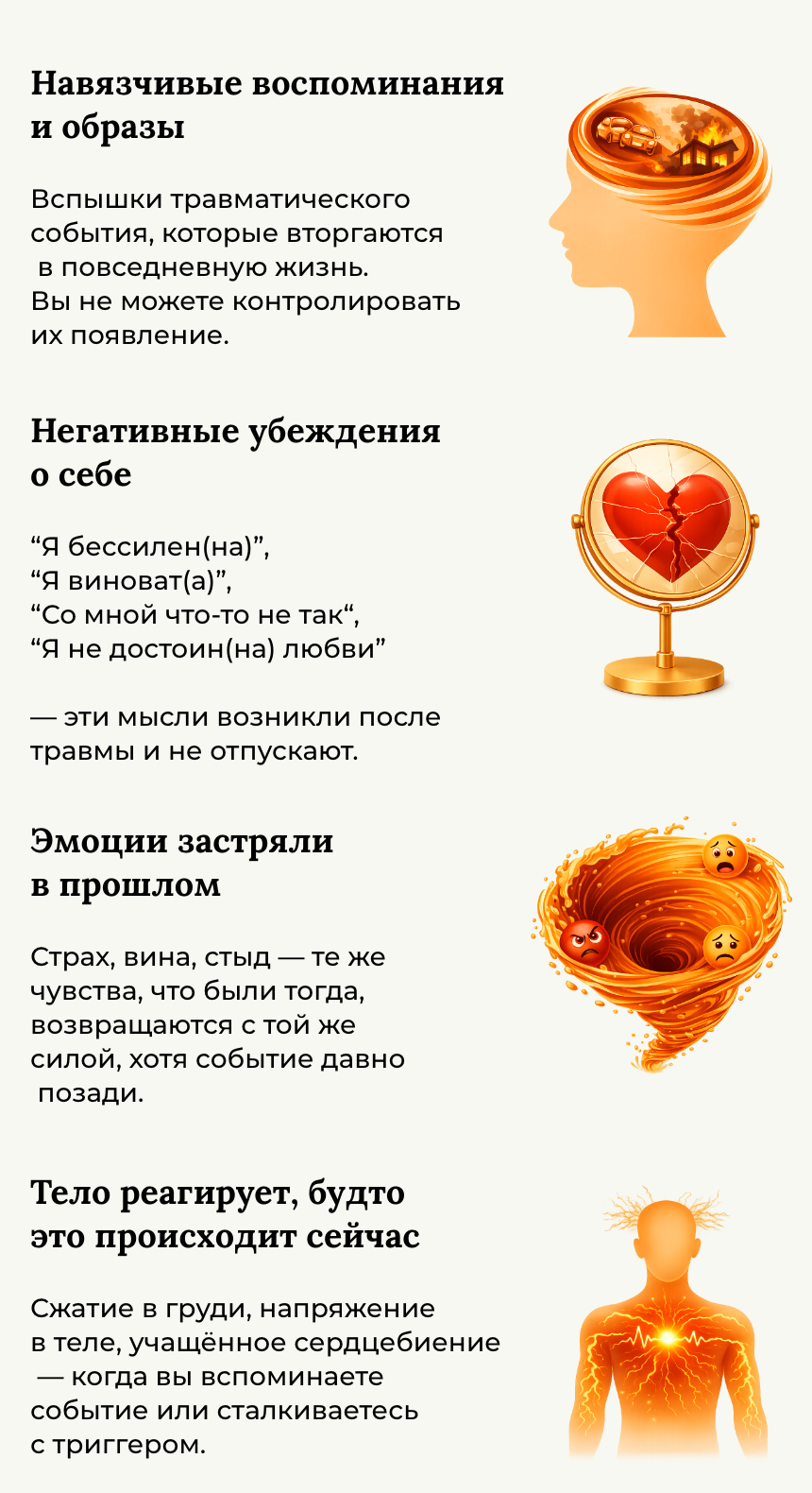 Сжатие в груди, напряжение в теле, учащённое сердцебиение — когда вы вспоминаете событие или сталкиваетесь с триггером.